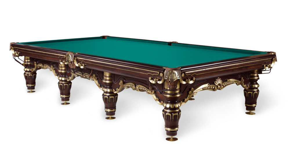 Бильярдный стол «Император-Люкс», украсит любые апартаменты. Резные узоры на лафете из натурального дерева, качественный сланец игрового поля, лучшие сукно и бортовая резина. С художественной точки зрения подлинным произведением искусства «Император-Люкс» делает выкраска. Шикарная отделка элементов стола поталью, по старинной технологии золочения. Ритм золоченых элементов объединяет резьбу ручной работы. Авторское патинирование и семь тонких слоев лака придают золоту глубину, а древесине благородный вид.