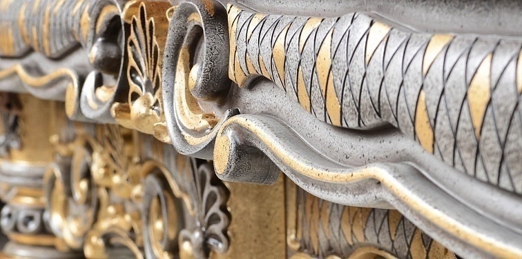 Бильярдный стол «Ренессанс Гранж»— создан для роскошных, ярких и... утонченных интерьеров. Декор стола наполнен духом эпохи Ренессанса, а искусственно состаренная поверхность — наполняет историзмом. Выразительный рельеф поверхности нарушается тончайшей структурой мелких выпуклостей и шероховатостей. Фактура «с отголосками старины» позволяет придать поверхности вид натурального камня, поэтому весь рельеф напоминает резьбу по камню. Антикварная выкраска стола выполняется вручную, в авторской технике с помощью нанесения золотой потали и золочения сусальным золотом.