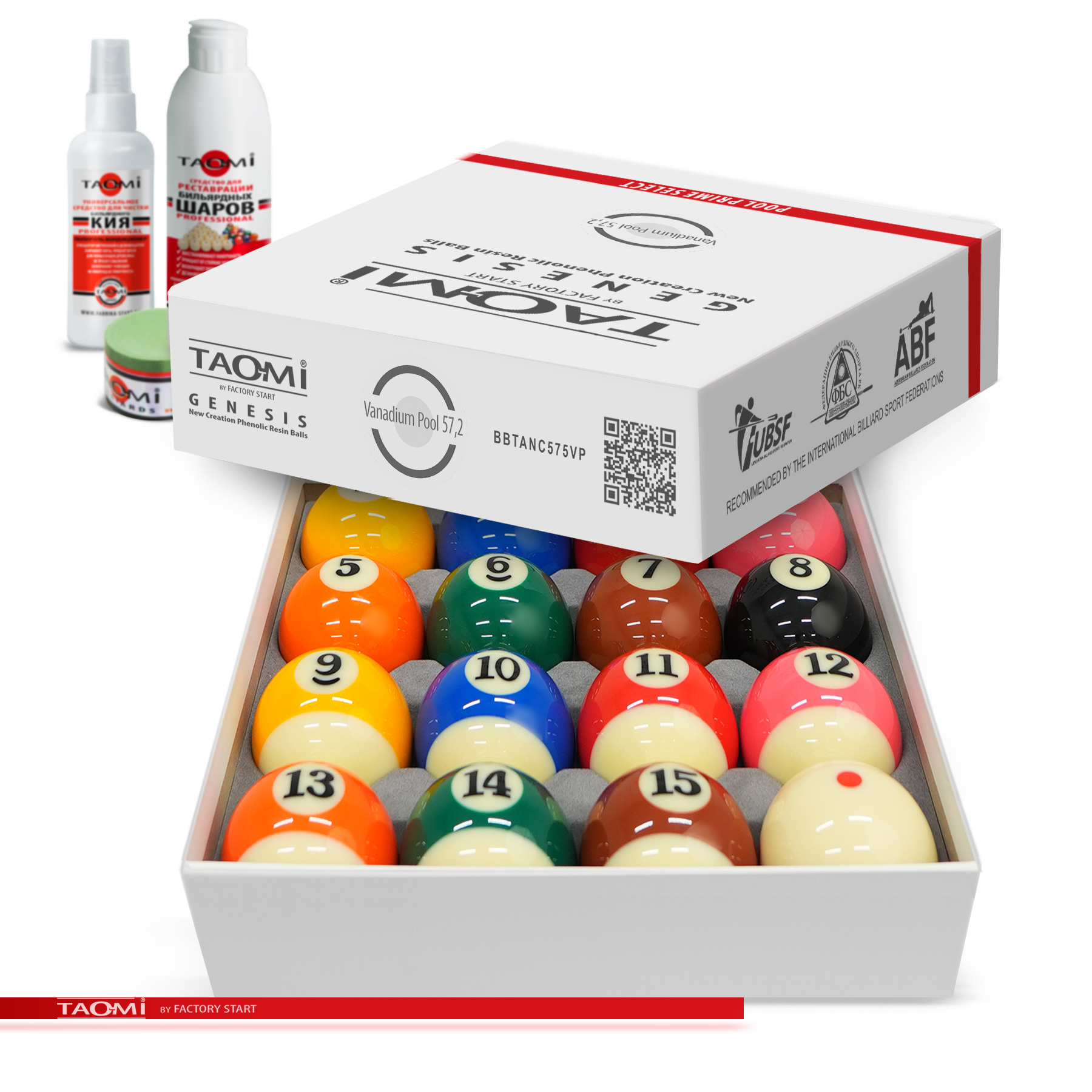 Шары TAO-MI GENESIS V-Pool 57.2 мм – эталон точности и долговечности для игры в амеркианский пул. Продукт нового поколения собственного бренда Фабрики «Старт», изготовленный по запатентованной технологии.