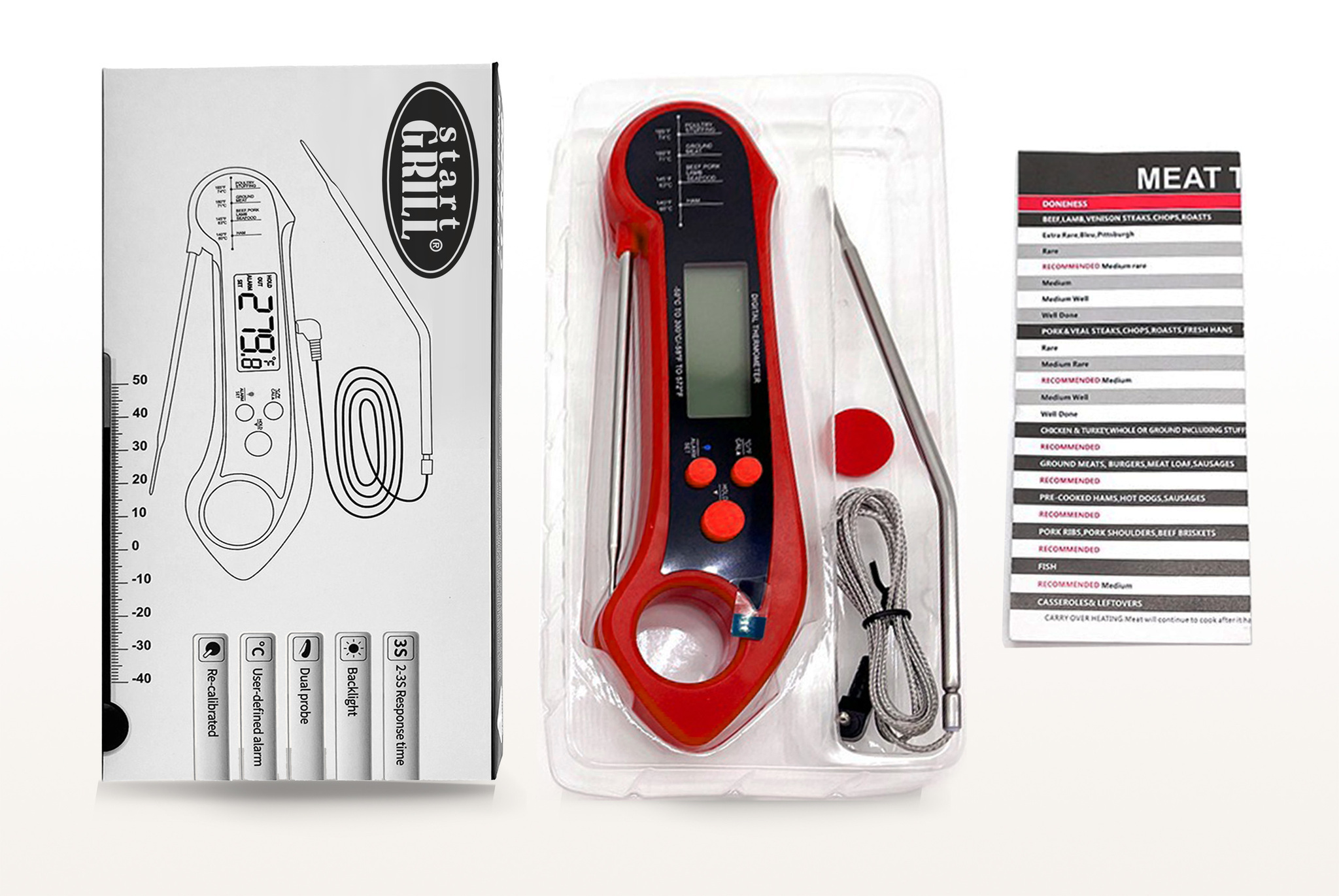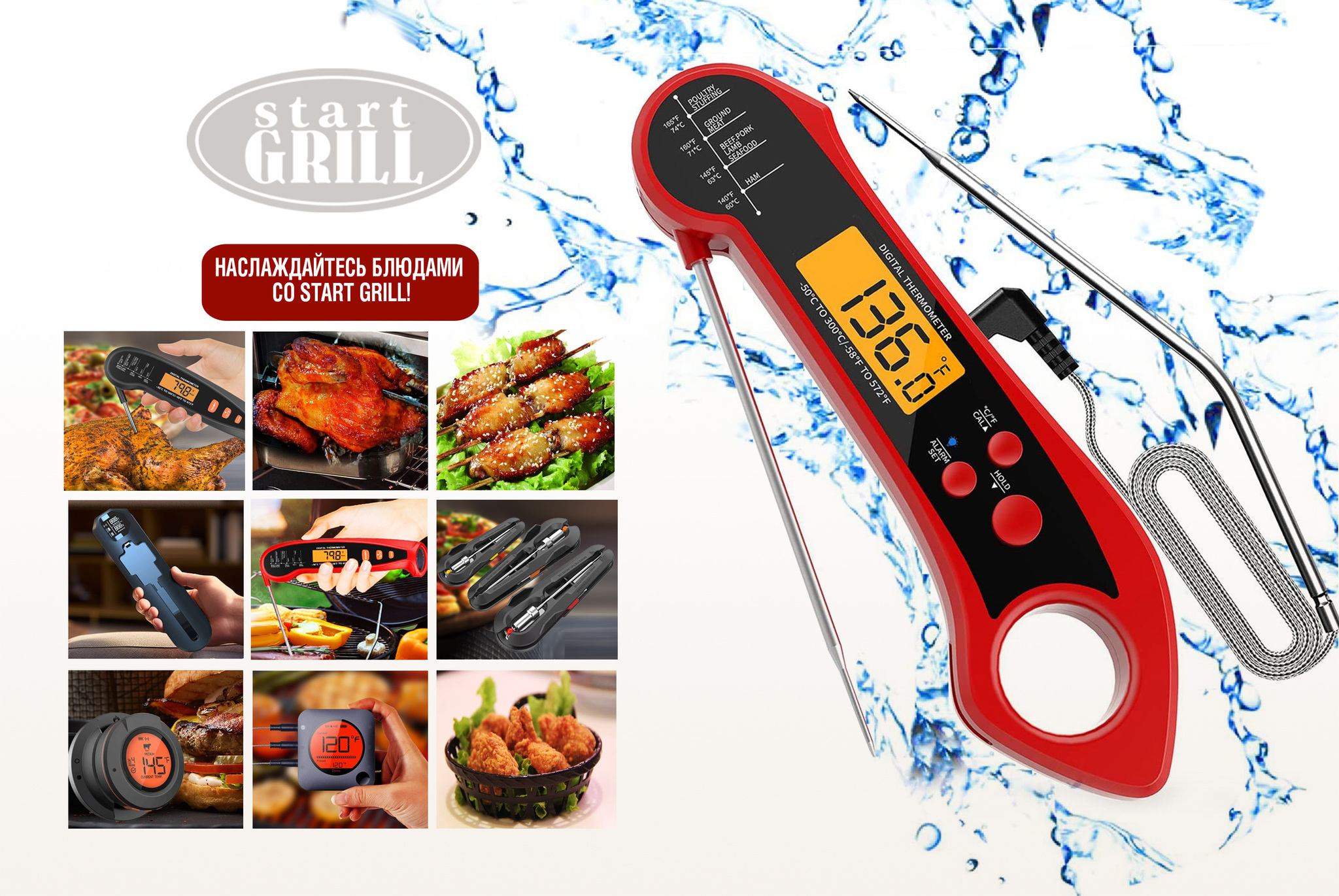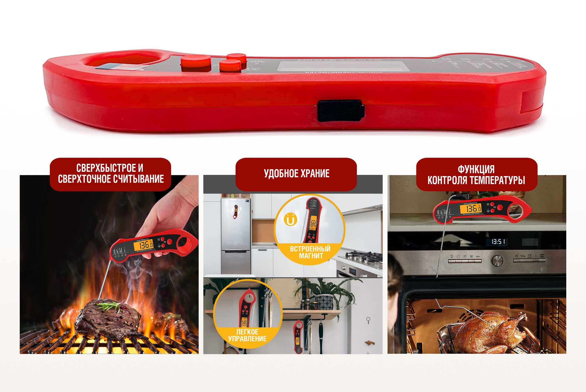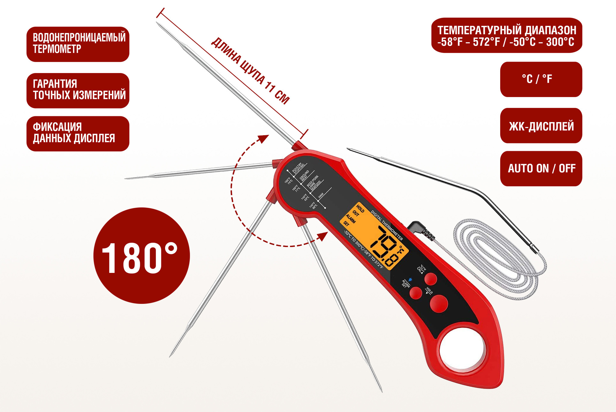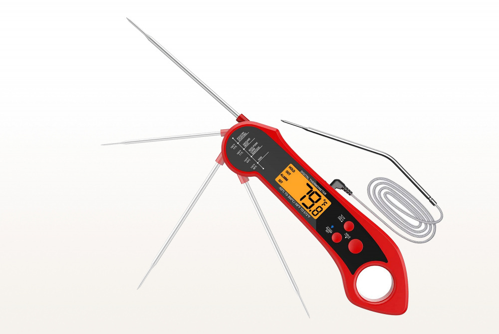 Складной цифровой термометр Model 2 — надежный и удобный инструмент для точного контроля процесса приготовления блюд. Термометр оснащен двумя типами датчиков: проволочным щупом для духовки и жарки, а также поворотный тонким зондом из нержавеющей стали для мяса и других продуктов. Диапазон измерения от -50 °C до 300 °C #40;от -58 °F до 572 °F#41; делает его универсальным для контроля температуры приготовления различных блюд. Удобный для считывания даже в темноте дисплей с яркой белой подсветкой покажет температуру с точностью до ±1°F #40;±1°C#41; #40;в диапазоне -20 °C до 150 °C / 45 °F до 302 °F#41;. Управление с помощью кнопок на корпусе из водонепроницаемого и экологичного ABS-пластика включает функции фиксации температурных данных #40;HOLD#41;, сигнализации о высокой температуре #40;предупреждение о перегреве#41;, а также энергосбережение #40;автоматическое отключение через 5 минут#41;. Удобное хранение термометра обеспечивает отверстие для подвешивания, а также внутренний магнит, который позволяет закрепить инструмент на металлической поверхности. Термометр работает от одной батарейки CR2032,nbsp;nbsp;которая входит в комплект. Цифровой термометр Model 2 — идеальный выбор как для профессиональных поваров, так и для начинающих кулинаров. Благодаря водонепроницаемости и прочному корпусу подходит для активного использования на кухне.