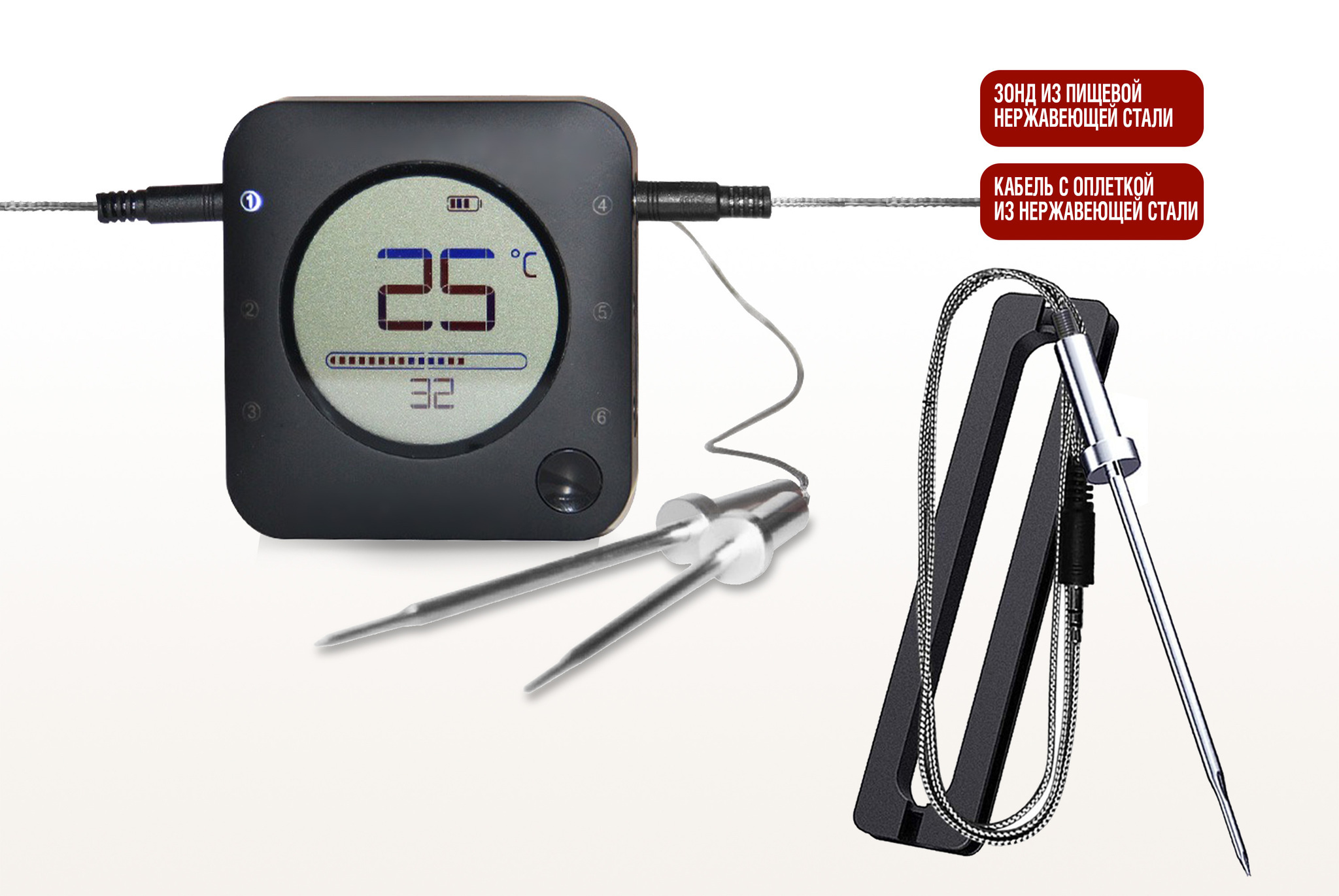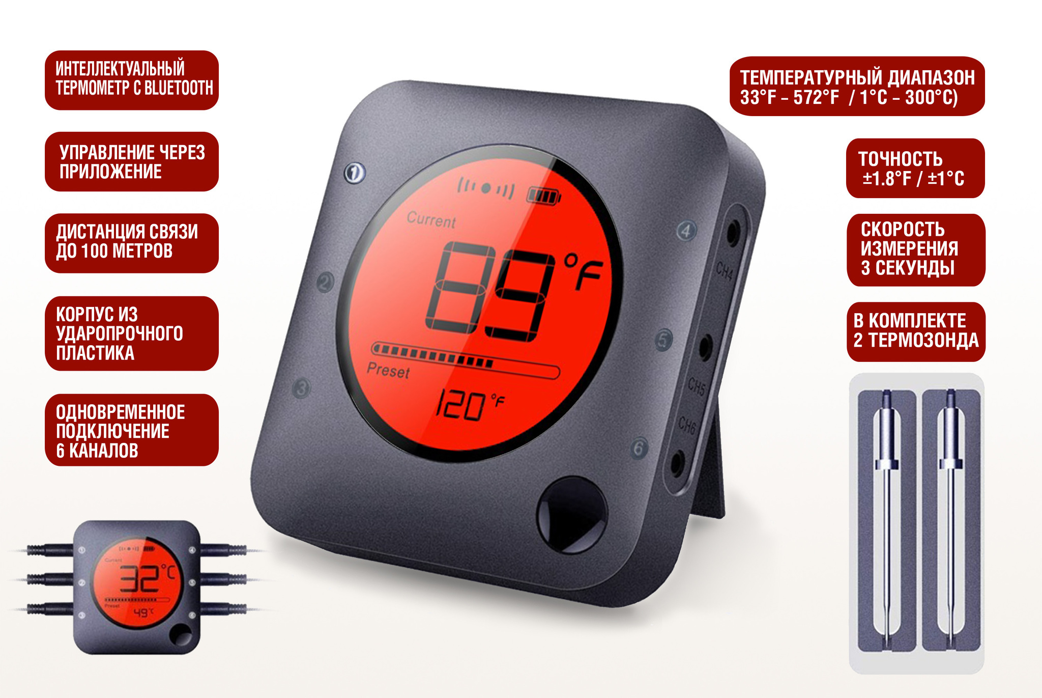 Интеллектуальный цифровой термометр Model 3 с Bluetooth сочетает удобство беспроводного контроля и профессиональную точность измерения. Model 3 поддерживает 6 каналов подключения для одновременного мониторинга до 6 зондов. В комплекте с термометром идет 2 тонких термозонда из нержавеющей стали для легкого погружения в мясо, рыбу, выпечку и другие продукты. Диапазон измерения от 1°C до 300°C #40;от 33°F до 572°F#41; делает его универсальным для контроля температуры приготовления различных блюд. Удобный для считывания дисплей покажет температуру с точностью до ±1.8°F #40;±1°C#41;. Удаленный мониторинг через смартфон упрощает процесс, позволяя держать температуру приготовления под контролем на расстоянии до 100 метров. Управление через мобильное приложение по Bluetooth 5.0 включает функцииnbsp;nbsp;переключения между °C/°F, настройкиnbsp;nbsp;оповещений о достижении заданной температуры, одновременного мониторинга до 6 зондов. Корпус термометра выполнен из ударопрочного ABS-пластика с элементами из алюминиевого сплава. Термометр работает от двух батареек AA,nbsp;nbsp;которые входит в комплект. Цифровой термометр Model 3 идеален для гриля, копчения, sous-vide, выпечки и других способов приготовления пищи.